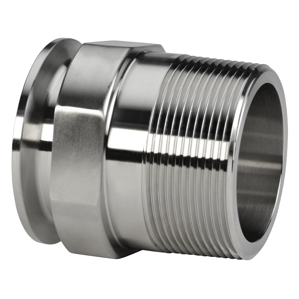The 21MP Tri-Clamp and Male NPT Adapter is a sanitary clamp fitting designed to connect Tri-Clamp ferrules to female NPT pipes, valves, or equipment. They are constructed of either 304 or 316L stainless steel. The 21MP comes in a variety of sizes; the Tri-Clamp (Tube O.D.) is available from ½" up to 4", and the male NPT threaded connection ranges in size from ¼" to 4".