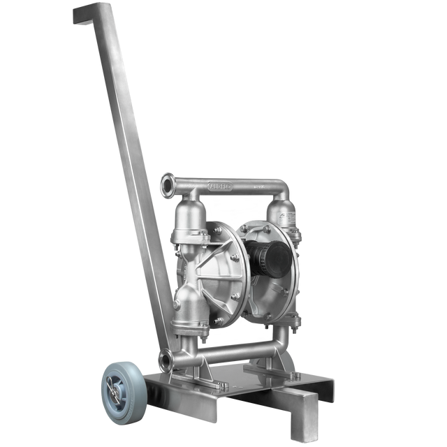 The All-Pur FDA-Series AODD pump is designed for fluid transfer in the food and beverage industries. The All Pur is mounted on a stainless steel Canadian-made cart. Like all All-Flo pumps, this pump is built to last with an air mechanism that features the fewest moving parts of any pump on the market. This pump also has a simple streamlined bolted body design with minimal moving wet end parts, which allows for easy maintenance and repairs. This is a highly efficient metal FDA-approved pump that will give you years of reliable service.