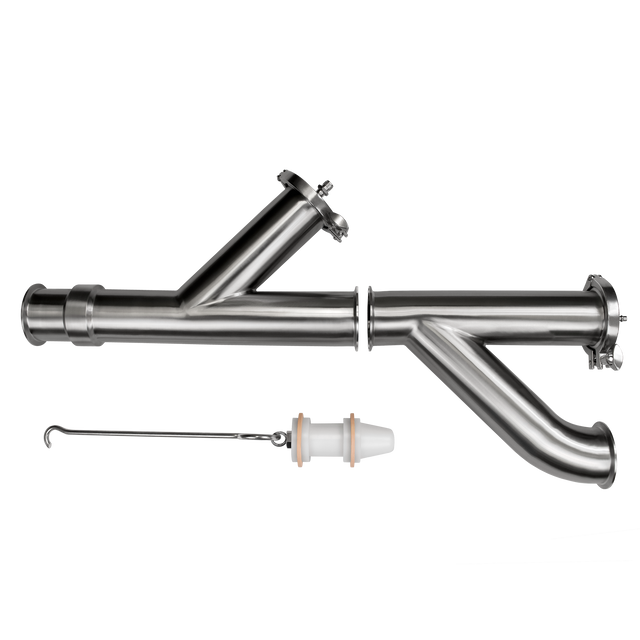 The T316L Product Recovery System (PIG System) is designed to be added to your product line to clear the tubing of residue and reduce product loss. This air operated system is attached via Tri-Clamp and features a "PIG" that is propelled through elbow or tee process lines moving the remaining product with it. A bar in the second lateral wye stops the PIG from leaving the system and allows you to easily remove it through the wyes branch using the provided handle. The PIG system seamlessly clears out viscous and slow moving products, resulting in faster changeovers and fewer washouts. The product recovery system consists of a PIG catcher, PIG launcher, the PIG, and a retriever handle.