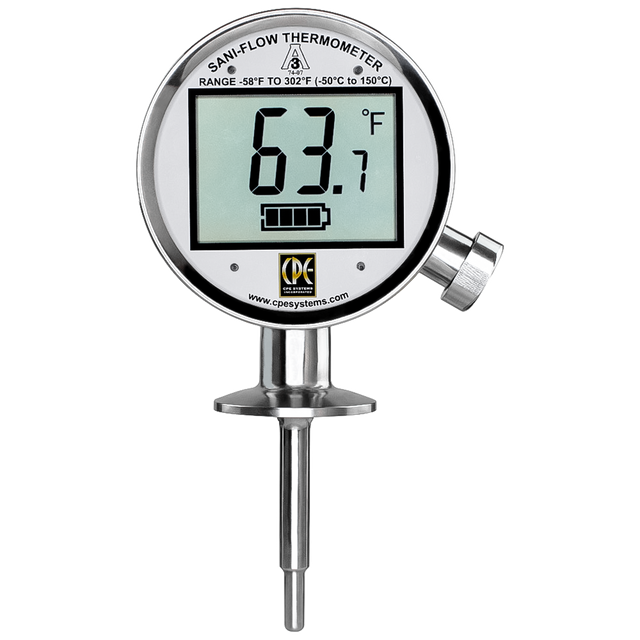 Our Sani-Flow Sanitary Digital Thermometer, designed and manufactured in the USA by Chicago Stainless is an affordable, dependable, versatile thermometer designed for the food processing industry. It is designed to withstand harsh environments and to last for years with minimal maintenance.